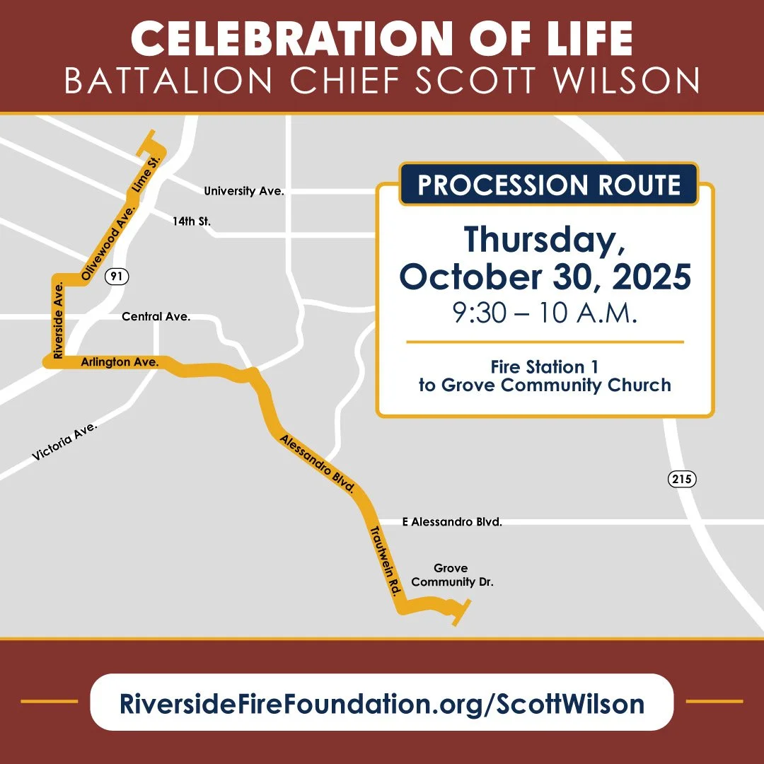 On Thursday, October 30, 2025, a funeral procession honoring Riverside Fire Department Chief Scott Wilson will take place beginning at approximately 9:30 a.m. The procession will depart from Fire Station 1 (3401 University Avenue) and follow the route below before concluding at The Grove Community Church, 19900 Grove Community Drive: