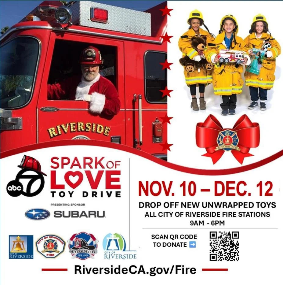 The City of Riverside Fire Department will join ABC7 and firefighters throughout Southern California in the “Spark of Love” Toy Drive from November 10 to December 12, 2025. The campaign collects any new, unwrapped toys, sports equipment, blankets and gift cards for underserved children and teens (0-17 yrs. old) in the Los Angeles, San Bernardino, Orange, Ventura and Riverside counties. Over the past three decades the Spark of Love Toy Drive has successfully collected more than nine million toys.